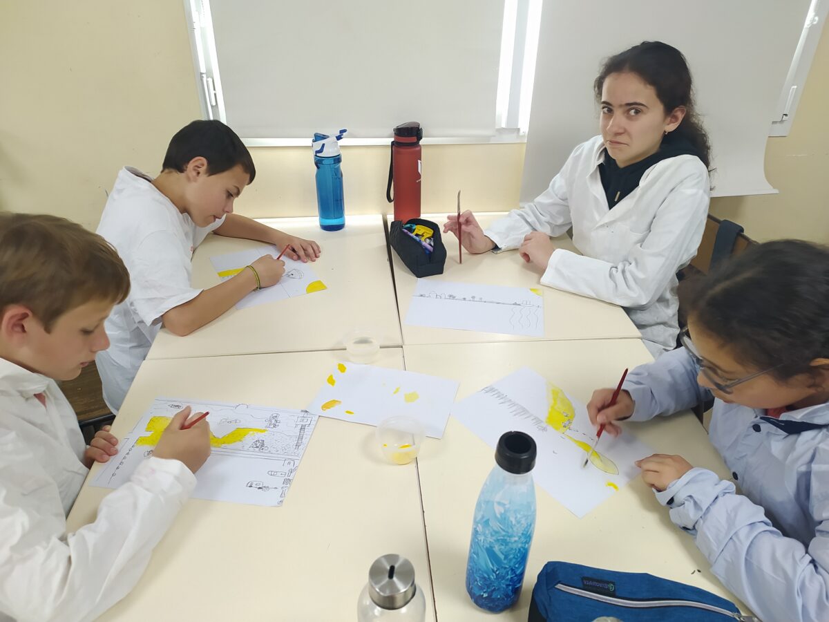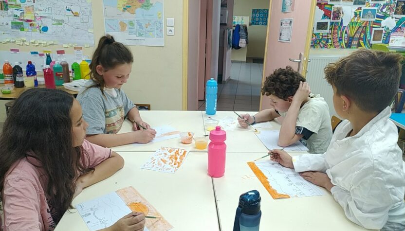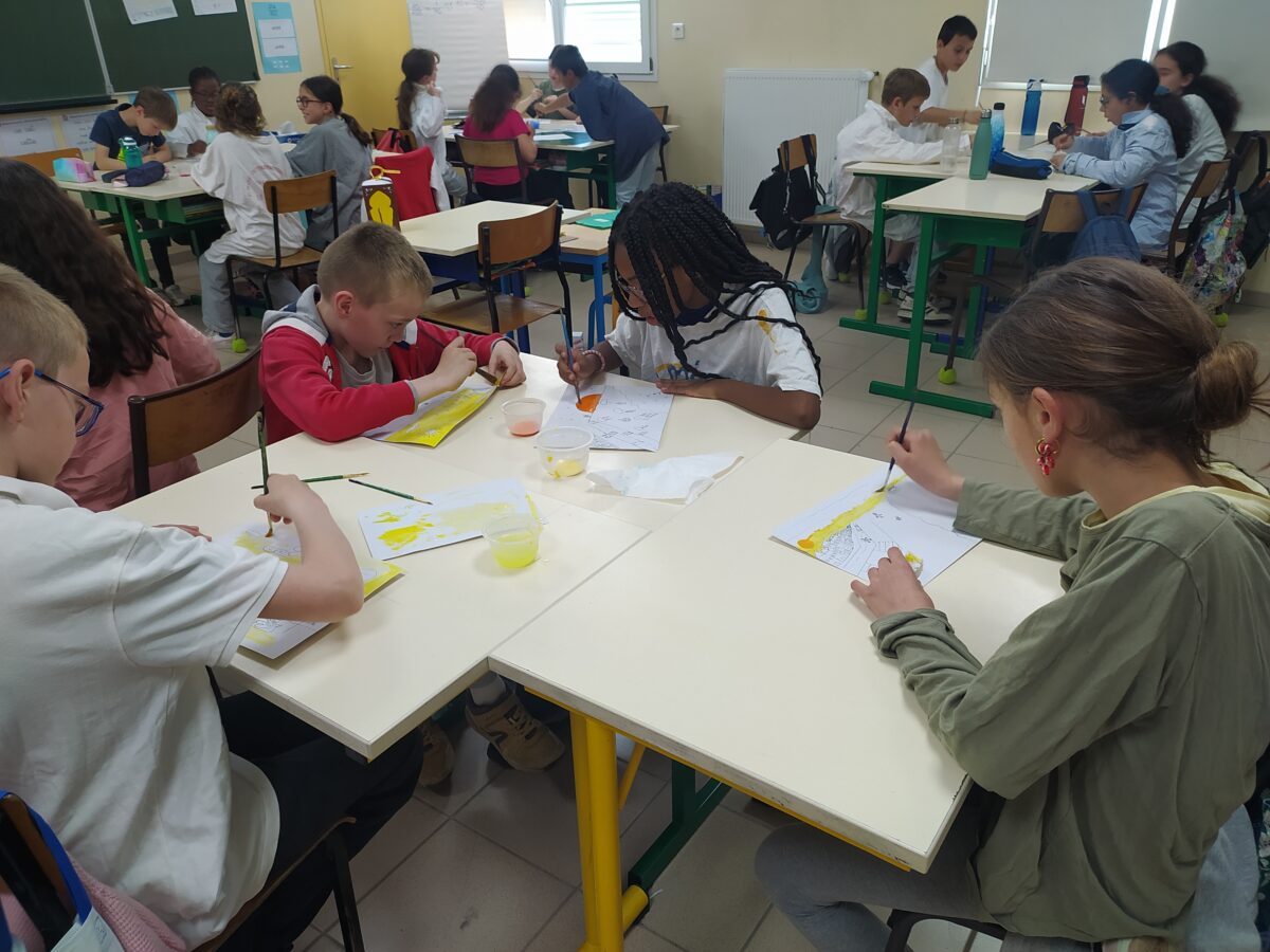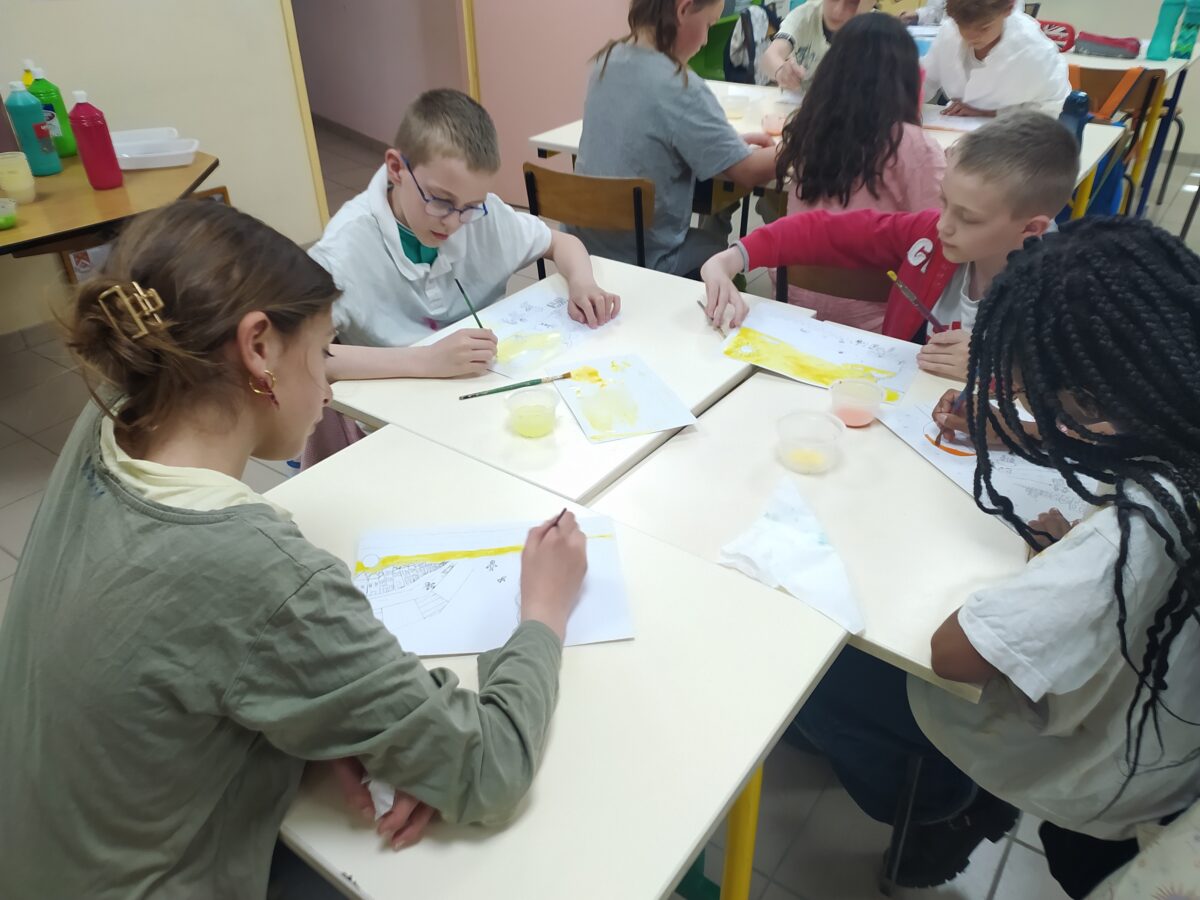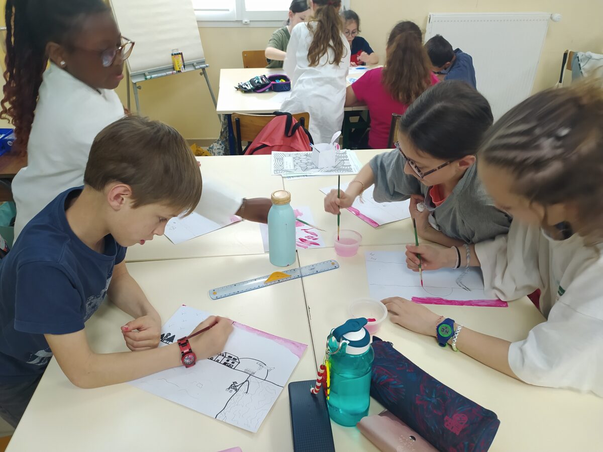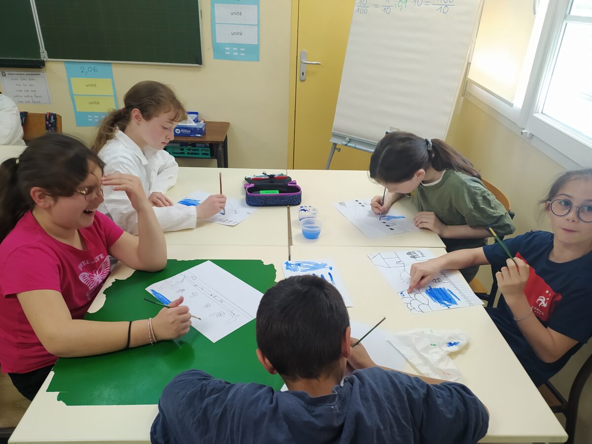 La fin de journée était consacrée à notre projet pour le Salon du livre de Sucé sur Erdre. Nous avons terminé les dessins de bord de mer avec de la gouache et de l’eau pour un effet » aquarelle ».